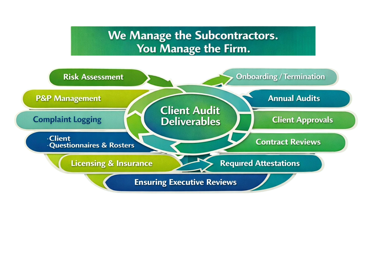 And beyond audit season, the work never stops. Firms must maintain year-round operational and compliance evidence, including licensing and insurance tracking, attestations, subcontractor files, client questionnaires, roster requests, and ongoing oversight requirements.